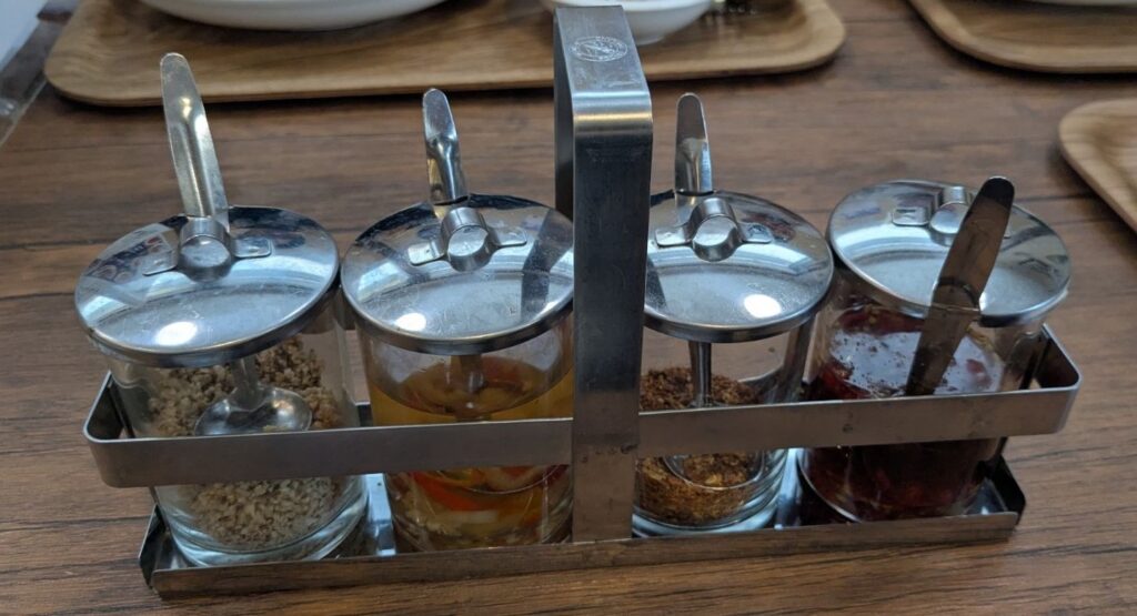 調味料も豊富でアレンジも可能です。一番左はくるみとゴマ・・かな?辛みがマイルドになって辛い方にはいいと思います。逆に右から2番目は優しい顔をして激烈辛かったです…、、、辛みを増したい方にはこのあたりがいいかもしれません。